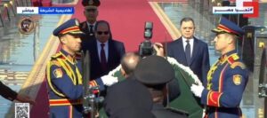 وضع الرئيس عبد الفتاح السيسي فور وصوله لأكاديمية الشرطة لحضور حفل عيد الشرطة، إكليلاً من الزهور على النصب التذكاري، حيث يقام الحفل بحضور وزير الداخلية وعدد من الوزراء والشخصيات العامة والرموز الوطنية وقيادات وزارة الداخلية.