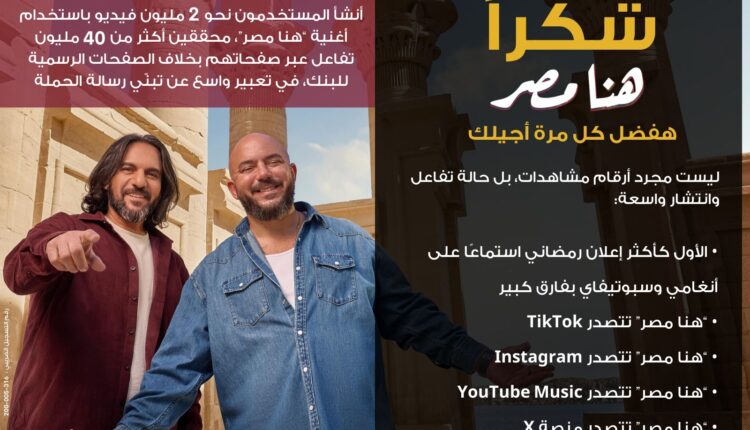 فقد أنشأ المستخدمون ما يقرب من 2 مليون فيديو باستخدام أغنية “هنا مصر” عبر منصات التواصل الاجتماعي، محققين أكثر من 40 مليون تفاعل عبر صفحاتهم، وذلك بخلاف التفاعل المحقق عبر الصفحات الرسمية للبنك التي نُشرت عليها الأغنية، في تعبير واضح عن تبنّي الجمهور لرسالة الحملة ومشاعرها.