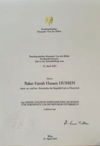 في لحظة امتزج فيها الاعتراف بالتقدير، والرمز بالرسالة، كرّمت جمهورية النمسا سعادة السفير بكر فتاح حسين، سفير جمهورية العراق لدى النمسا وسلوفينيا وسلوفاكيا، بمنحه وسام الشرف الكبير من الذهب مع الوشاح (The Grand Decoration of Honour in Gold with Sash)، وهو ثاني أعلى وسام في النظام الوطني النمساوي، يُمنح تقديرًا للخدمات الاستثنائية التي تترك أثرًا مستدامًا في مجالات السياسة والدبلوماسية والثقافة والتعاون الدولي.