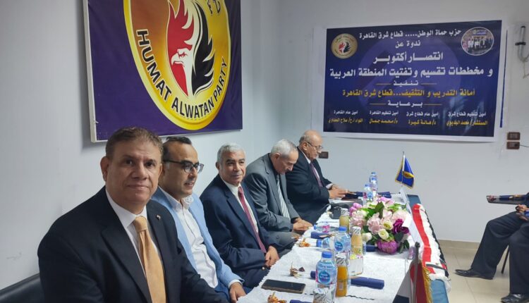 اقامت امانة التدريب والتثقيف بقطاع شرق القاهرة بحزب حماة الوطن ندوة احتفالية بنصر اكتوبر العظيم تحت عنوان انتصار اكتوبر ومخططات تقسيم وتفتيت المنطقة العربية , وقد قام بإدارة الندوة الدكتور/ جمال حمدان امين التدريب والتثقيف بقطاع شرق القاهرة , الذى اوضح بكلمته التي استهل بها الندوة أنه لابد وأن نعلم أولادنا قيمة الوطن وقيمة وتاريخ نصر أكتوبر العظيم ، وأنه لابد من توعية الشباب والنشء بقيمة الأوطان وبتاريخ مصر والتضحيات التي بذلتها القوات المسلحة في سبيل استعادة سيناء , وقد اعتلى منصة الندوة قامات عسكرية واستراتيجية وسياسية وتاريخية كبيرة وهم : اللواء أ.ح / طارق المهدي – عضو المجلس الأعلى للقوات المسلحة سابقاً ووزير الإعلام الأسبق ومحافظ الإسكندرية الأسبق , و اللواء محمد قشقوش – أستاذ الأمن القومي وزميل الأكاديمية العسكرية للدراسات العليا والاستراتيجية , وأ.د جمال شقرة – استاذ التاريخ المعاصر بجامعة عين شمس , .د أحمد عبد الدايم استاذ التاريخ الحديث والمعاصر بجامعة القاهرة – بالإضافة الى الداعية الإسلامي / ياسر سلمى