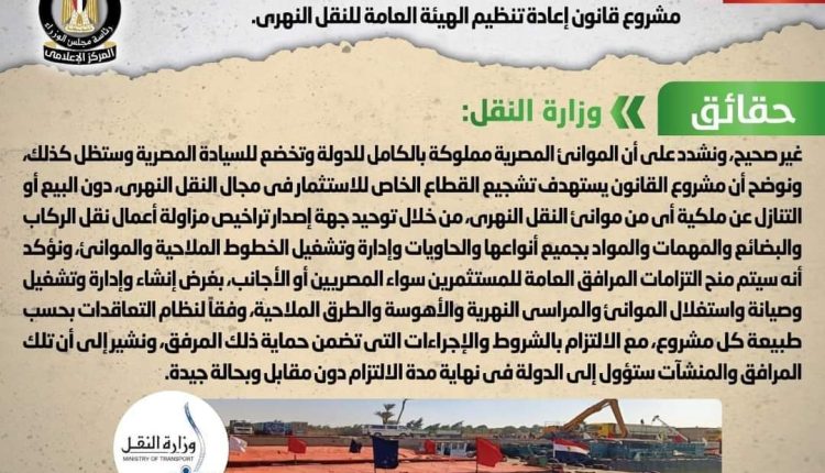 انتشر في بعض المواقع الإلكترونية وصفحات التواصل الاجتماعي أنباء بشأن اعتزام الدولة التنازل عن موانئ نهر النيل لصالح دولة أجنبية بموجب مشروع قانون إعادة تنظيم الهيئة العامة للنقل النهري، وقد قام المركز الإعلامي لمجلس الوزراء بالتواصل مع وزارة النقل، والتي نفت تلك الأنباء، مُؤكدةً أنه لا صحة للتنازل عن موانئ نهر النيل لصالح دولة أجنبية بموجب مشروع قانون إعادة تنظيم الهيئة العامة للنقل النهري، مُشددةً على أن الموانئ المصرية مملوكة بالكامل للدولة وتخضع للسيادة المصرية وستظل كذلك، مُوضحةً أن مشروع القانون يستهدف تشجيع القطاع الخاص للاستثمار في مجال النقل النهري، دون البيع أو التنازل عن ملكية أي من موانئ النقل النهري، من خلال توحيد جهة إصدار تراخيص مزاولة أعمال نقل الركاب والبضائع والمهمات والمواد بجميع أنواعها والحاويات وإدارة وتشغيل الخطوط الملاحية والموانئ، مُؤكدةً أنه سيتم منح التزامات المرافق العامة للمستثمرين سواء المصريين أو الأجانب، بغرض إنشاء وإدارة وتشغيل وصيانة واستغلال الموانئ والمراسي النهرية والأهوسة والطرق الملاحية، وفقاً لنظام التعاقدات بحسب طبيعة كل مشروع، مع الالتزام بالشروط والإجراءات التي تضمن حماية ذلك المرفق، مُشيرةً إلى أن تلك المرافق والمنشآت ستؤول إلى الدولة في نهاية مدة الالتزام دون مقابل وبحالة جيدة.