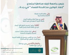 جاء ذلك خلال كلمة رئيس جامعة نايف العربية، في افتتاح أعمال الاجتماع الوزاري الأول لأجهزة انفاذ قوانين مكافحة الفساد في الدول الأعضاء بمنظمة التعاون الإسلامي، الذي ينظم برعاية كريمة من الأمير محمد بن سلمان بن عبد العزيز آل سعود ولي العهد رئيس مجلس الوزراء وتستضيفه المملكة العربية السعودية ممثلة في هيئة الرقابة ومكافحة الفساد خلال الفترة من 20 – 21 ديسمبر الجاري، بمدينة جدة.