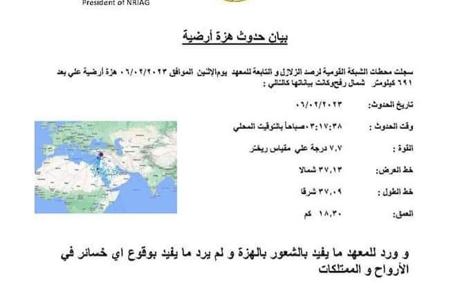 زالزال قوته 7.7 ريختر طبقا لتسجيلات محطات الشبكة القومية للزلازل التابعة للمعهد القومى للبحوث الفلكية والجيوفيزيقية،