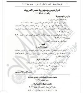 نشرت الجريدة الرسمية، قرار جمهوري لرئيس الجمهورية رقم 186 لسنة ۲۰۲۲.