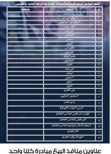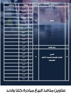 وتشمل المبادرة عددًا من فروع السلاسل التجارية الكبرى (خير زمان- أولاد رجب – عبدالله العثيم – كارفور- العابد- المحلاوي – أوسكار- خير بلدنا – راية ماركت – أسواق فتح الله – الفرجانى – هايبر الشرقية – إسبنس – كازيون – الشرق – أكسبشن- هايبر بلس- مول القاهرة- النساجون الشرقيون- جولدن مان هاوس- تاى هاوس- نيو أكتف أبوعلاء- راديو طلعت – العربى للأدوات الكهربائية – شركة الفيومى – هايبر وان – دايموند تكستال للملابس الجاهزة – الفار للتجارة – اللولو للأسواق التجارية – الطحان للتمور – المتوكل للاستيراد والتصدير)، بإجمالى 993 فرعا على مستوى الجمهورية.